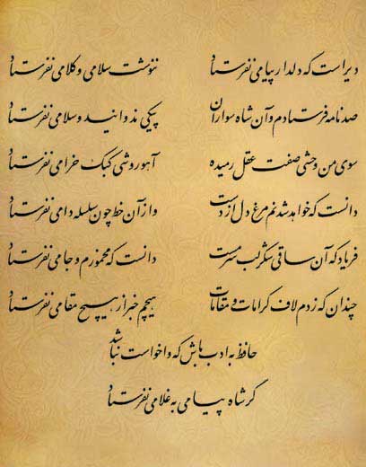 خیلی خوشحالم که از سایت شما دیدن و روح سرگردانم را با اشعار دلنشین مستانه شیرین کلام آرامش میبخشم ومن که درآن سطح نیستم که در باره حافظ چیزی گویم ولی ای کاش در آن عصر میزیستم که اوبود عشق با تمام ابعاد انسانی اش.