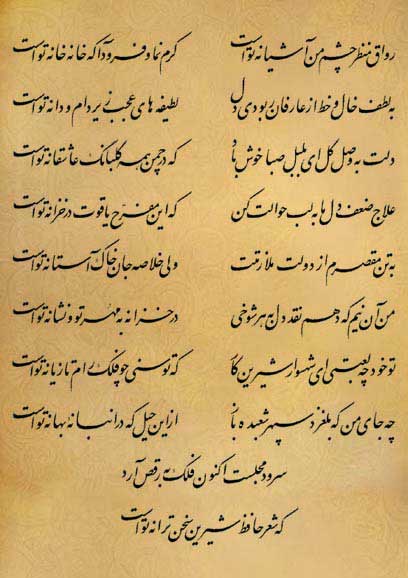 (۹) ای محبوب من،حالیا سرود مجلس تو با این ترانه حافظ شیرین سخن،زهره را در آسمان به رقص وا می دارد.