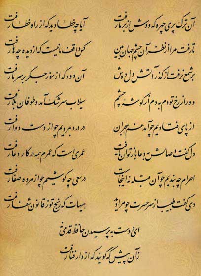 (9) اي دوست به ديدار و براي پرسش حال حافظ قدم رنجه كن، پيش از آنكه بگويند او از اين دنيا رفت.