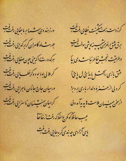 (7) به واعظ بگو از حافظ بدگويي نكند. او ازاين خانقاه (شهر) به دررفت. براي پاي آزادي بندي متصور نيست به هركجا رفت رفت. گذشت و تمام شد